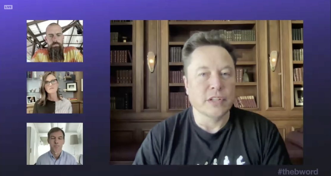 On Wednesday, Elon Musk appeared alongside Ark Invest CEO Cathie Wood, and Twitter CEO Jack Dorsey at the online “B Word” event, moderated by Steve Lee from Square Crypto.