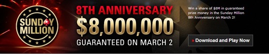 On Sunday the 2nd of March, Pokerstars will be hosting a special 8th anniversary Sunday Million tournament, where they will guarantee that the minimum prize pool will be a massive $8 million. The special anniversary Sunday Million will have the usual $215 buy-in, but will guarantee eight times as much money as usual.
