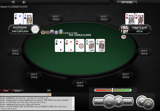 The final table turned into a German party as hdjgkfkgsdl battles it out with DrUPSWING for the title. A deal was made heads up and both players secured more than $877,000 leaving more than $150,000 to play for. On the final hand it was DrUPSWING’s trip deuces held up against hdjgkfkgsdl’s flush draw, as seen in the front page picture.