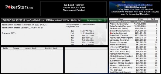 Turned out to be a great defensive stand for PlayinWasted as he jumped into the lead after grabbing a big pot from Allanon85 and held on from there. Daniel “Allanon85” Drescher would eliminate SwissCantMis in third when his AcKh held up versus the later’s Ah7d and Playing Wasted would ultimately win it all when his AsKs held court over the KcQs of Allanon85. PlayinWasted took home almost $1.5 million dollars, the 2013 WCOOP Main Event Title and the pride of being the Last German Standing.