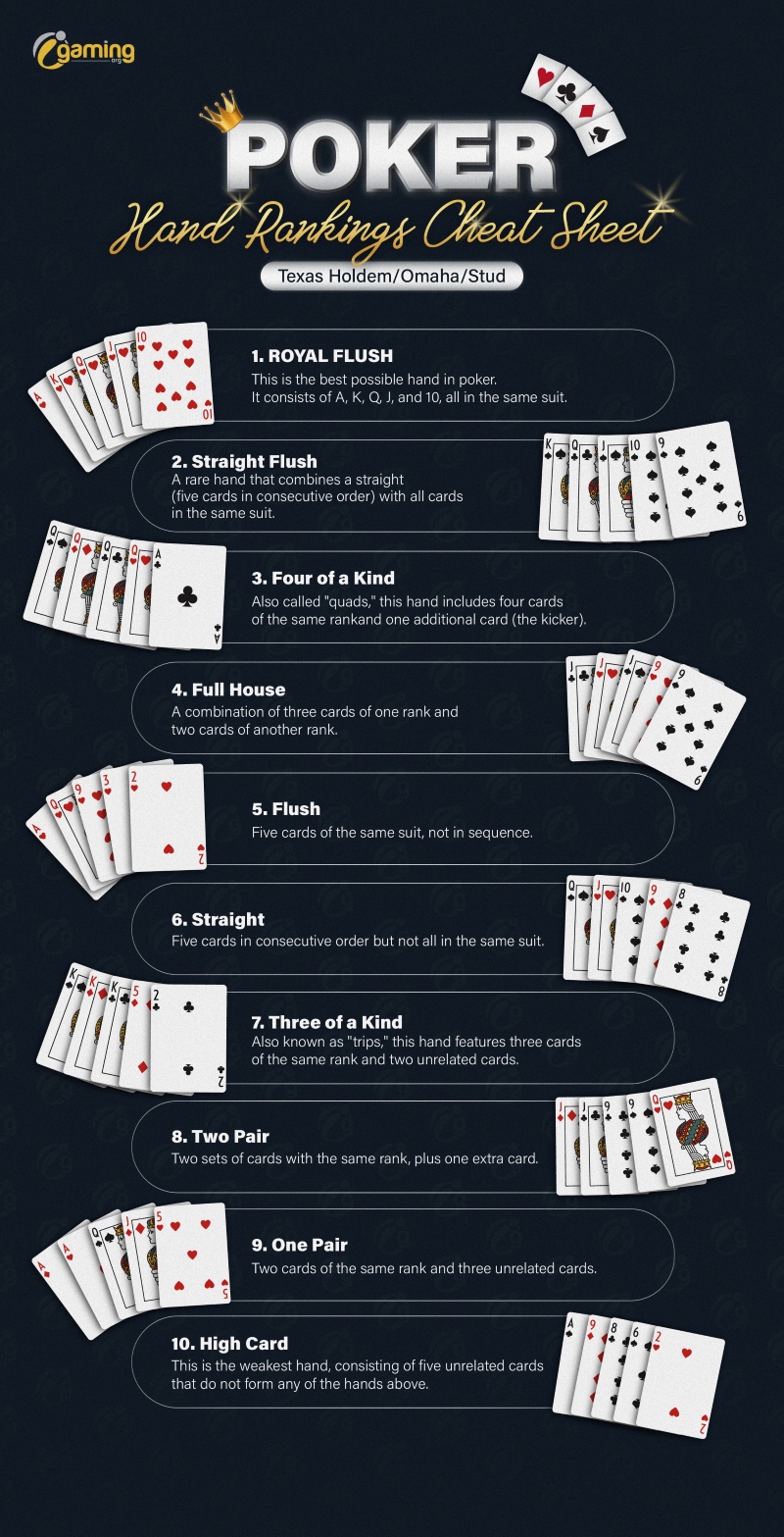 Below you find a downloadable cheat sheet to check your poker hand rankings. You can use this for games such as Texas Holdem, Omaha and Stud, among other games that use the same poker hand rankings.
